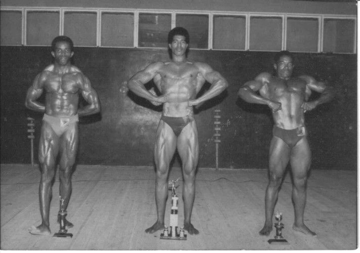 Originally from Guyana (in South America) he is also a two time former natural bodybuilding champion and was called for trials to represent Guyana at the Caribbean and Central American championships. (That's him in the center below winning the Jnr Mr Guyana title back in 87')